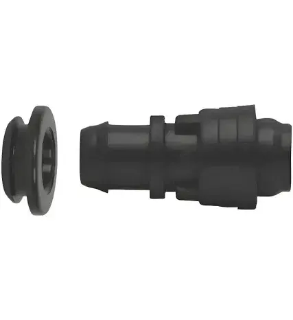 Conexão de plástico para mangueira, resistente e prática para sistemas de irrigação. Encaixe rápido, sem necessidade de ferramentas, oferecendo vedação segura para evitar vazamentos.